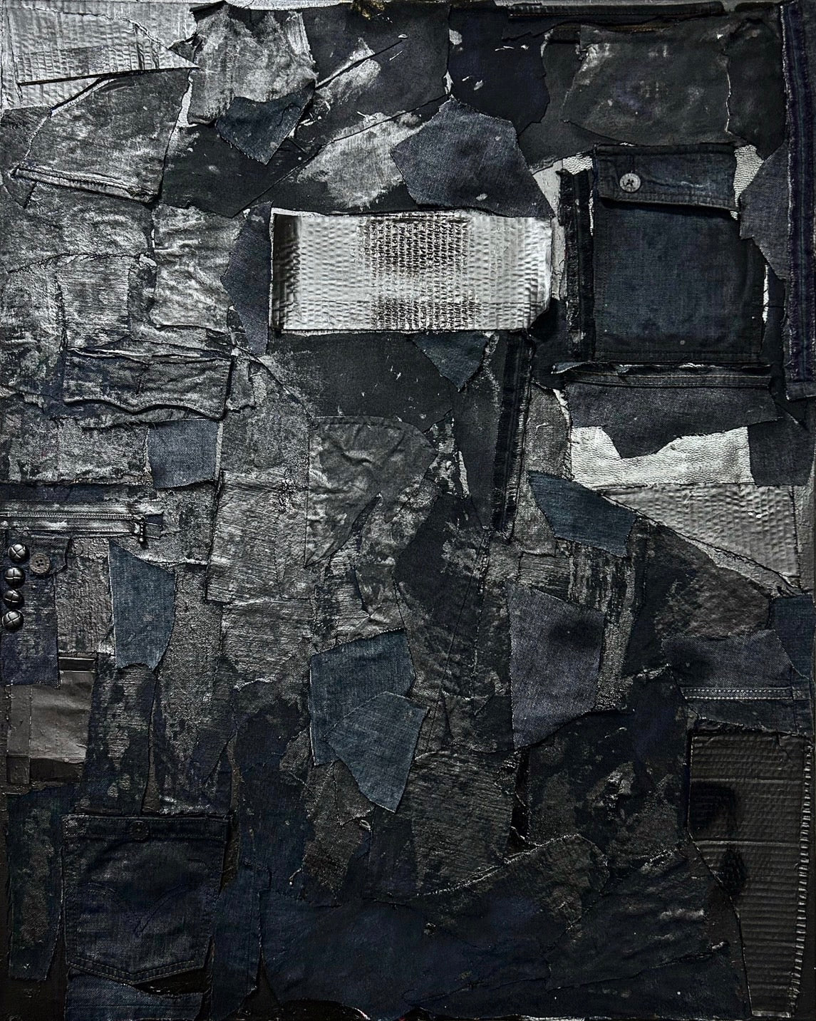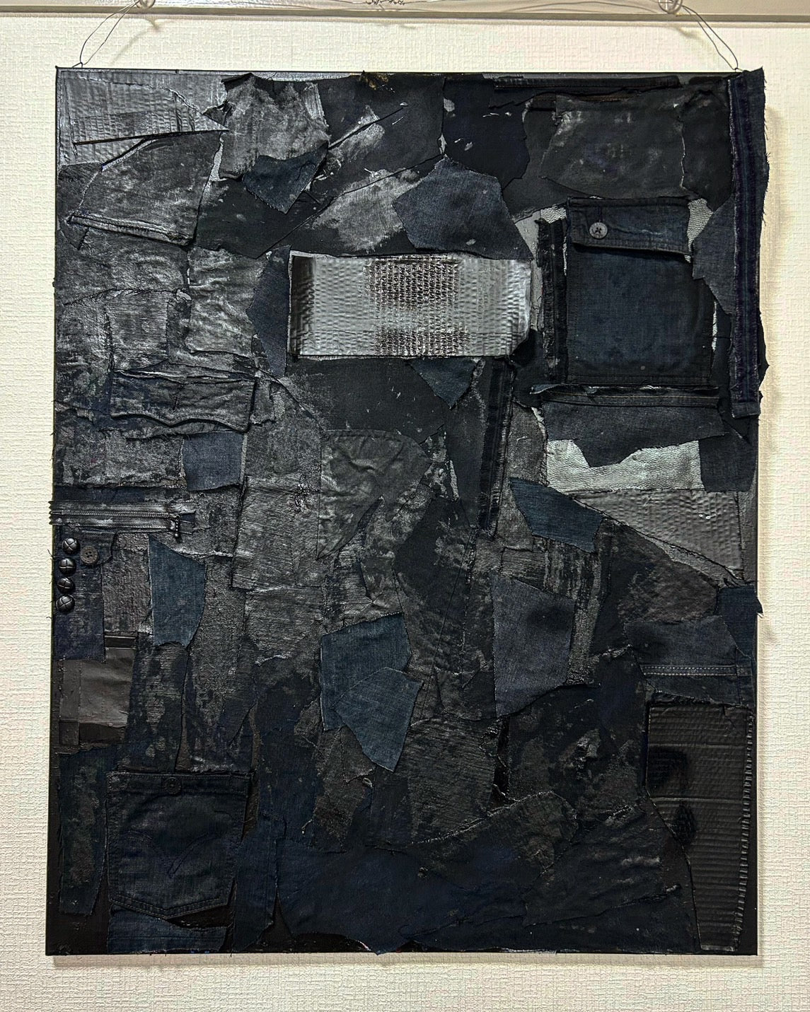 素材:デニム、レザー、ダンボール、タバコの空き箱、ボタン、ジッパー