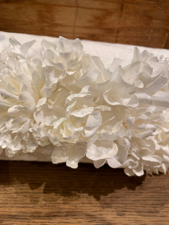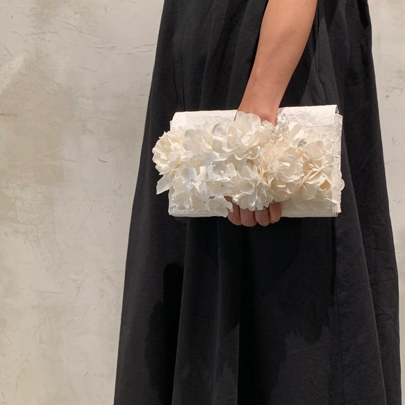 牛乳パックからつくった生地を使用し、1枚ずつ手作りした花が装飾されたクラッチバッグです。