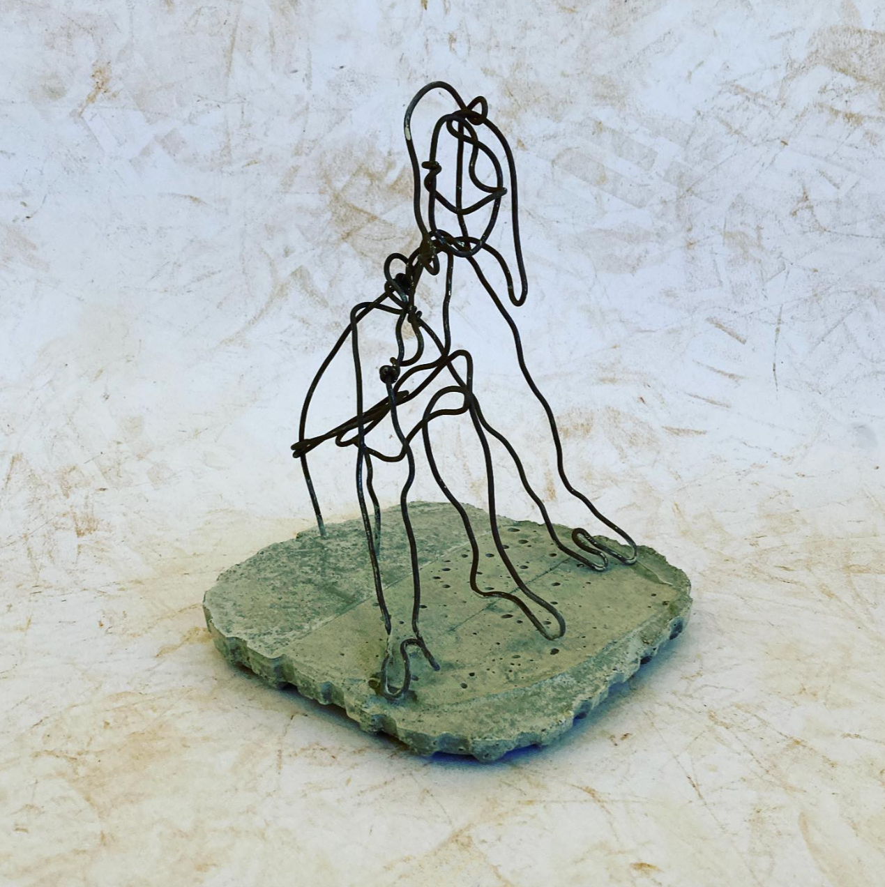 イタリアのぶどう畑での仕事を終えた錆びた針金を使っています。時間の経過とともに魂を宿らせた針金です。表面が2層に分かれたセメントの中から出てくる女性像は今から新しい世界に踏み込む瞬間をイメージています。