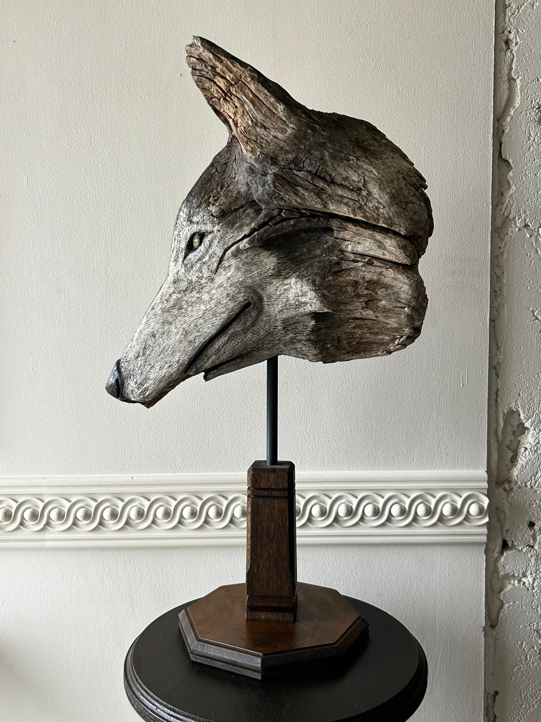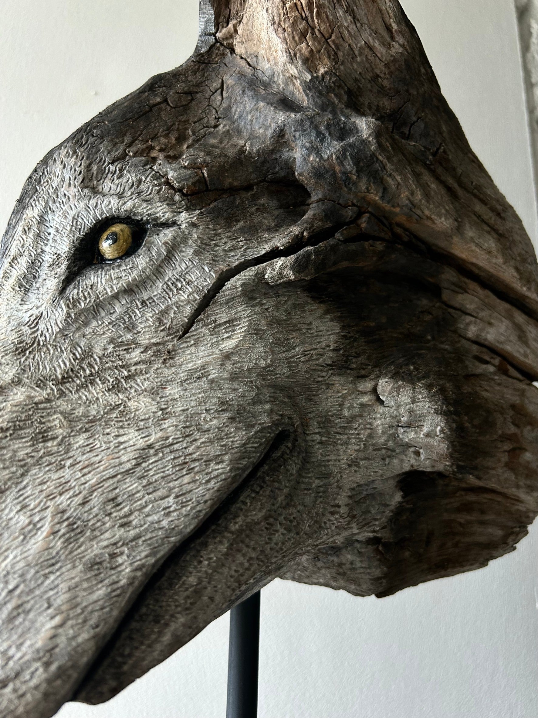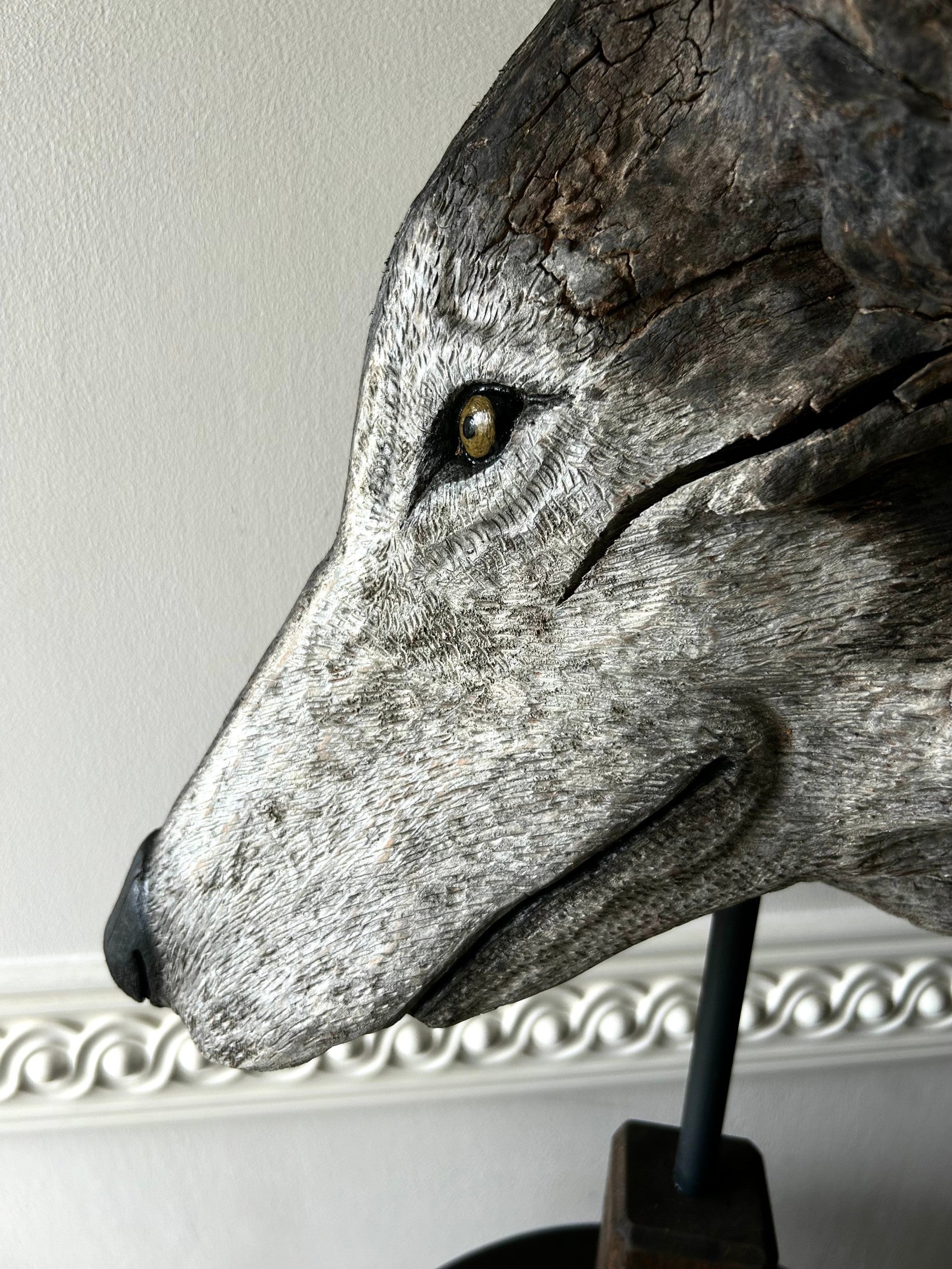 ウルフドッグ(狼犬)とは、言葉通り、オオカミと犬(ハスキーなど)の交配種です。 今回の流木は、ノーズのシルエットと、首元の立体的な流木表情が、毛のフサフサ感に見えたことで、ウルフドッグに見立てて彫刻しました。 目元のヒビ割れや流木うねり、あと印象的な眼の色が気に入ってます。 耳も流木から切り出して製作。こちらも流木の表情が活きています。