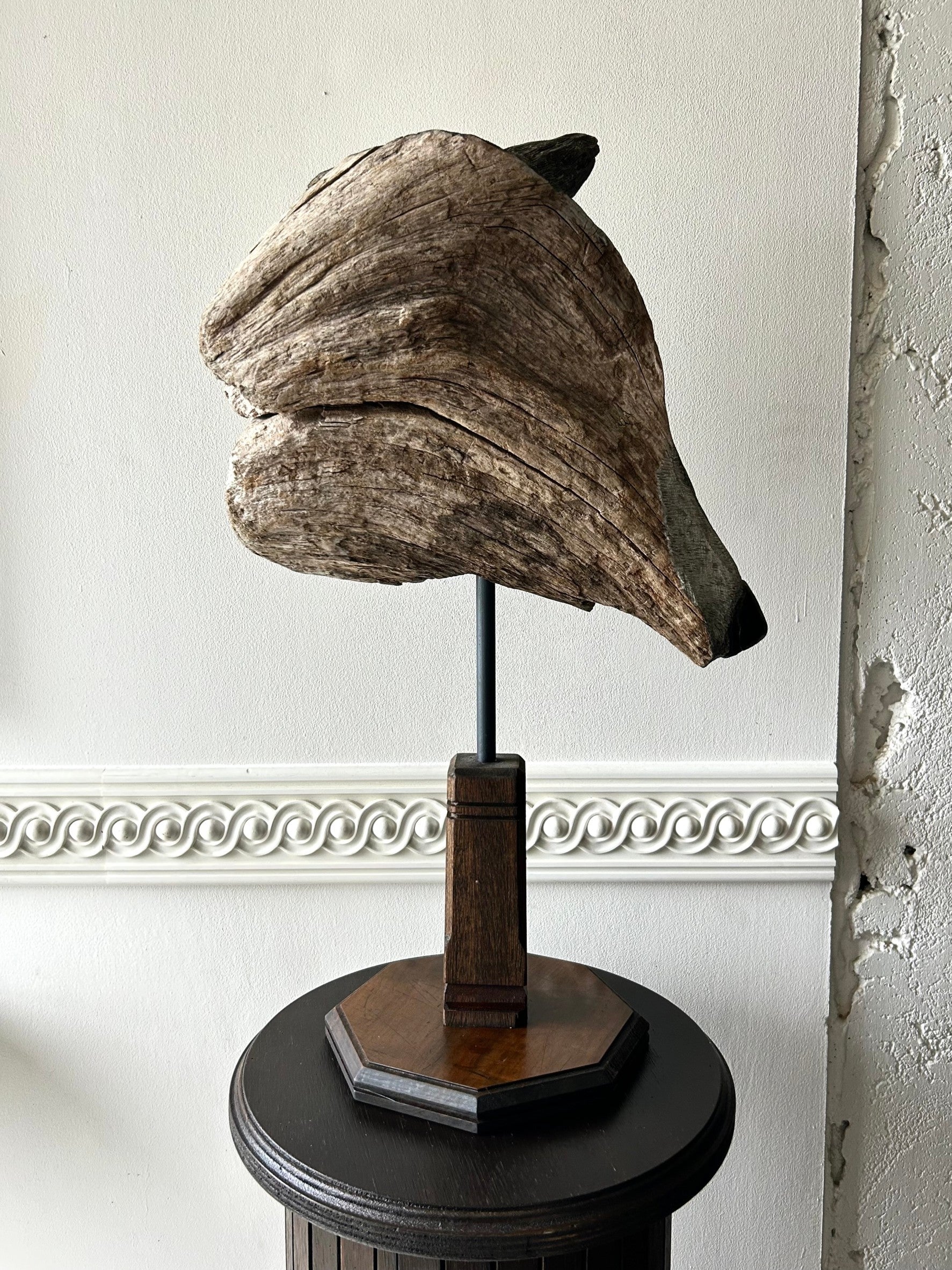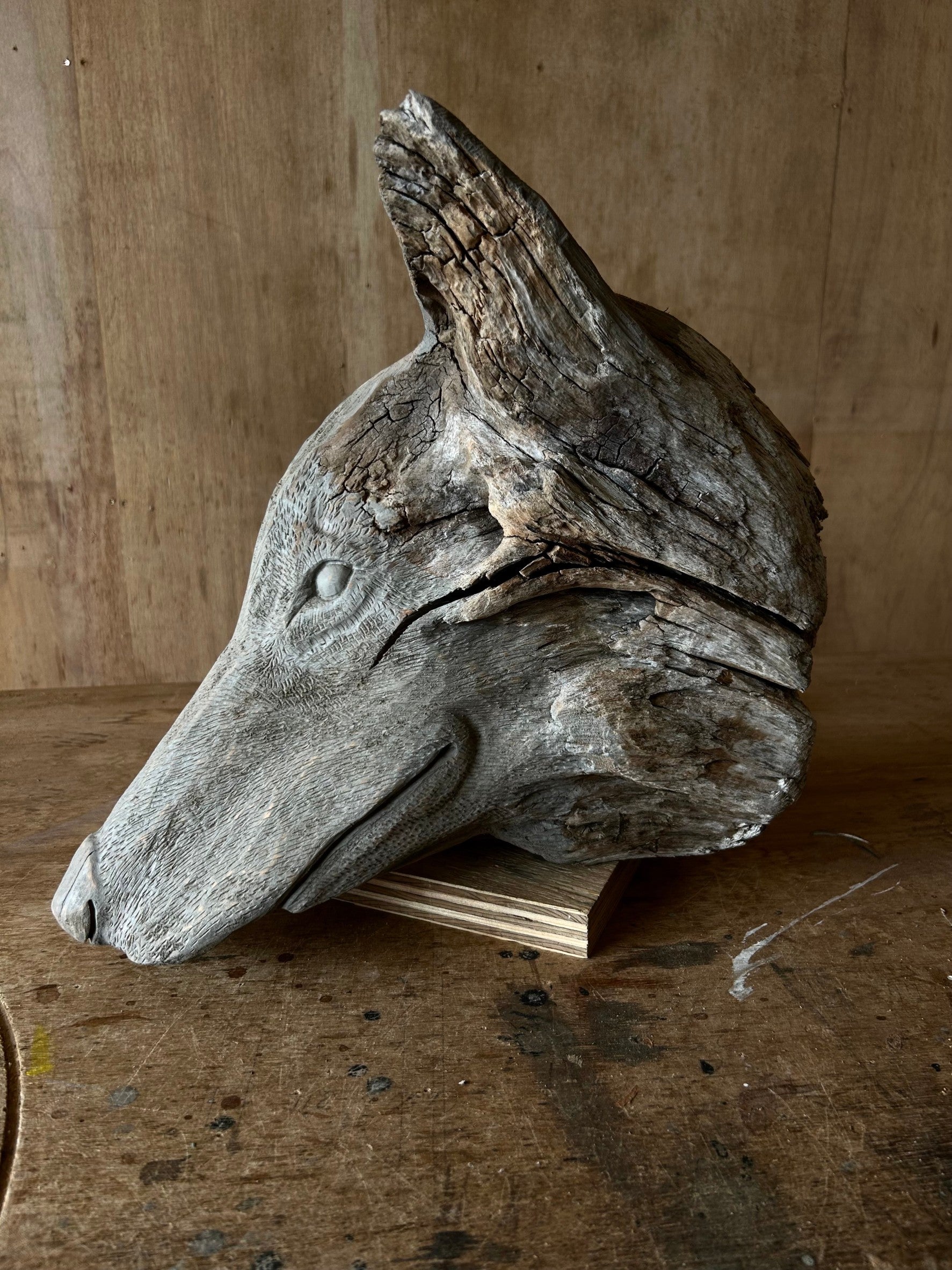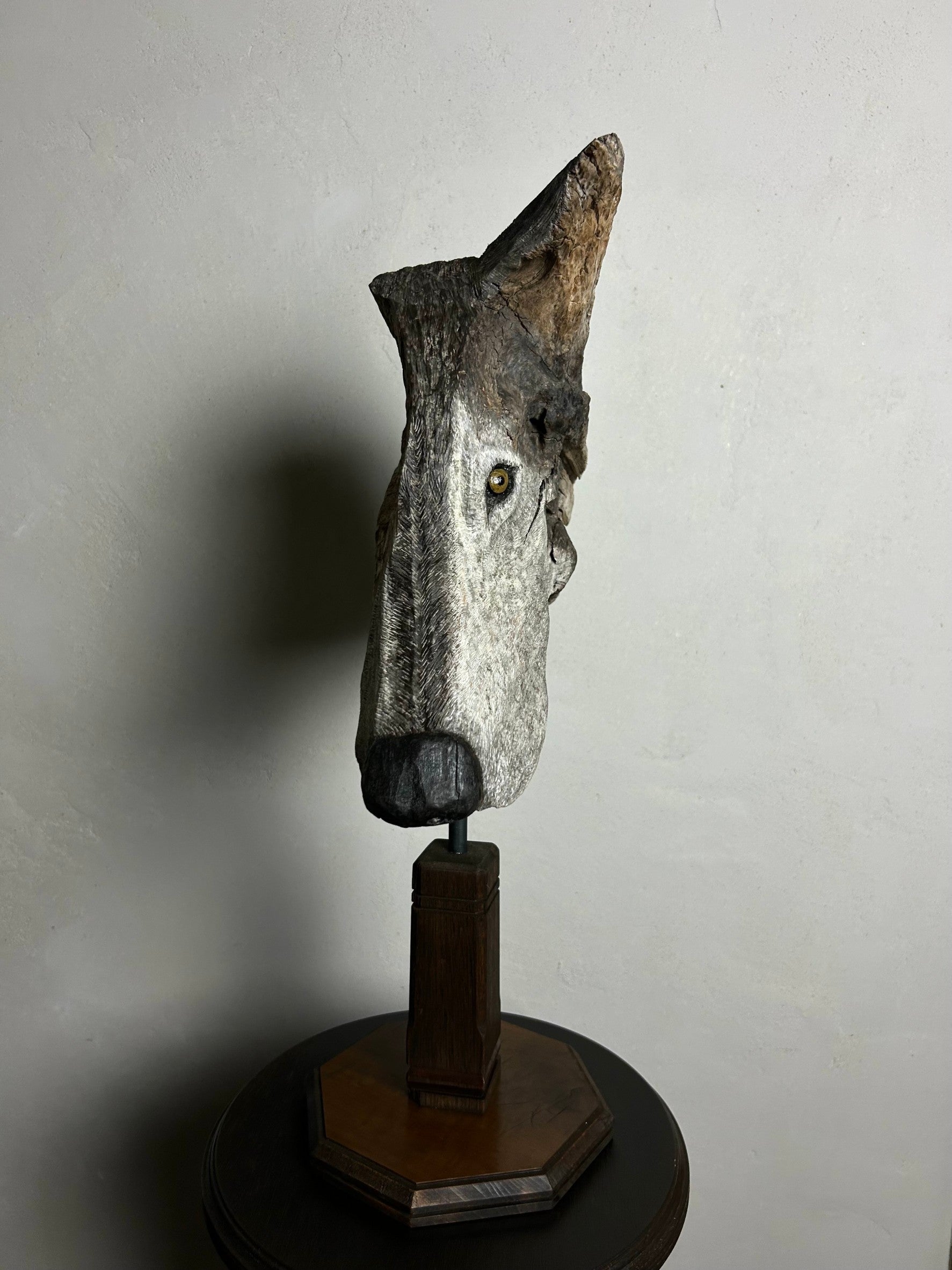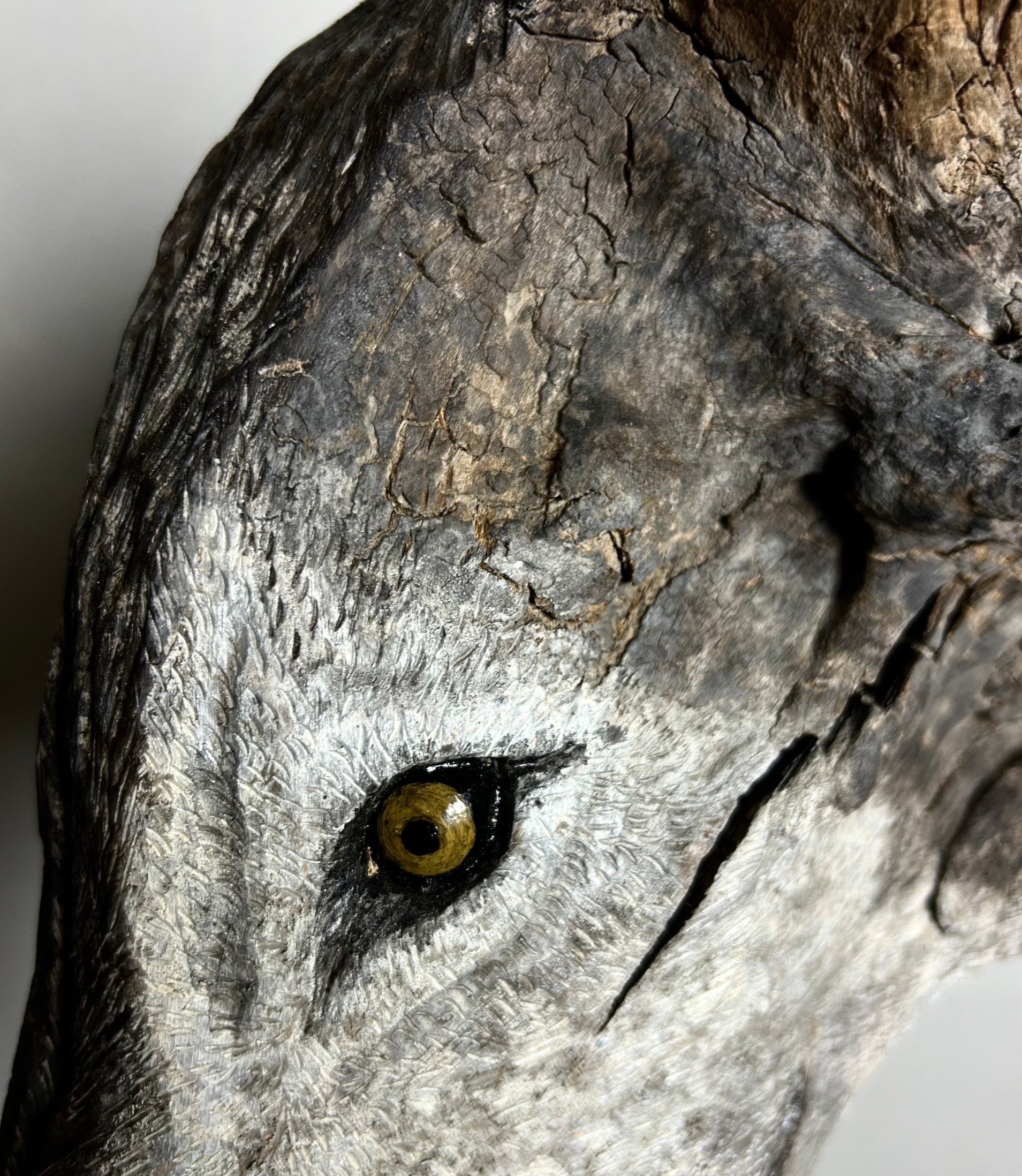 ウルフドッグ(狼犬)とは、言葉通り、オオカミと犬(ハスキーなど)の交配種です。 今回の流木は、ノーズのシルエットと、首元の立体的な流木表情が、毛のフサフサ感に見えたことで、ウルフドッグに見立てて彫刻しました。 目元のヒビ割れや流木うねり、あと印象的な眼の色が気に入ってます。 耳も流木から切り出して製作。こちらも流木の表情が活きています。