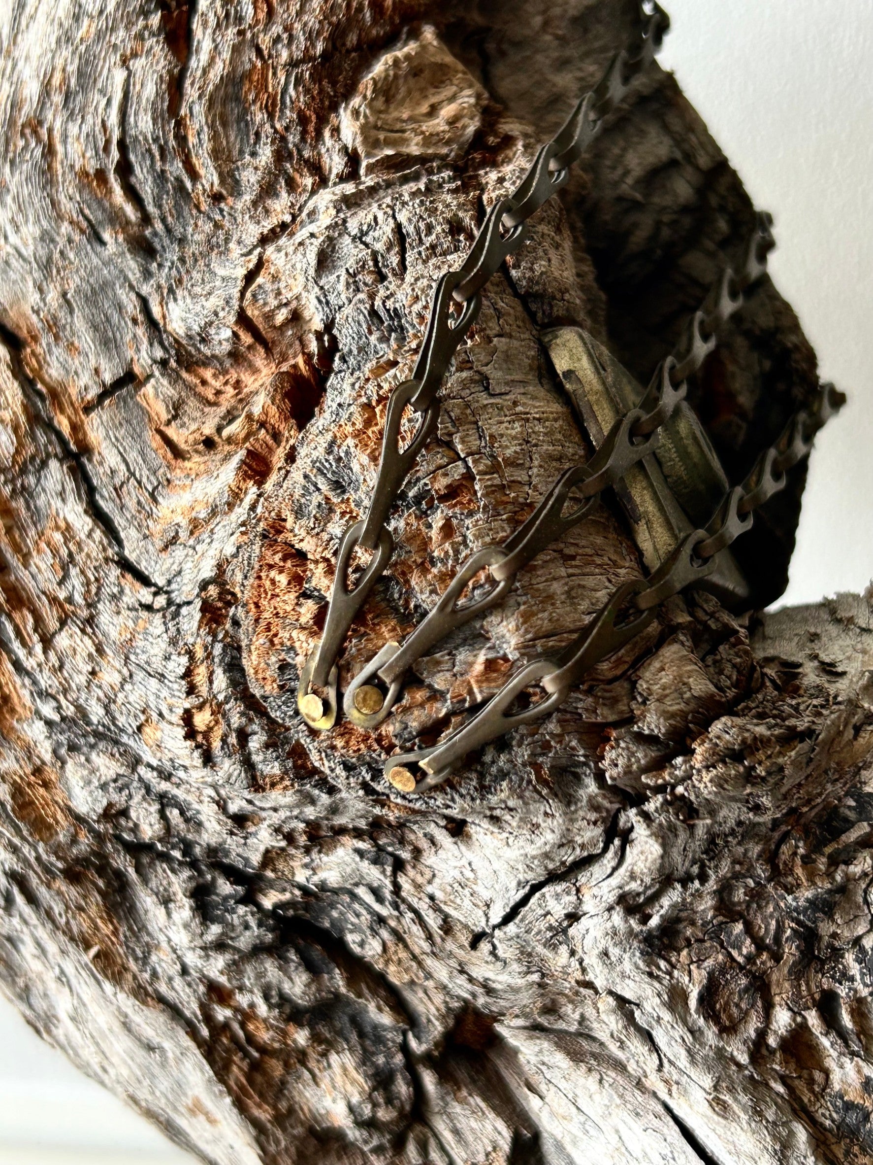 素材:流木、アンティークのバイオリンケース、古い軽量器のチェーン、アンティーク家具の一部
